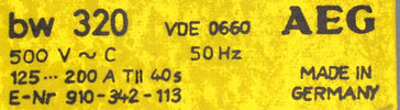 AEG Thermischer Überstromauslöser Typ bw 320 125-200A 40s E-Nr. 910-342-113 Ur=500VAC 50Hz