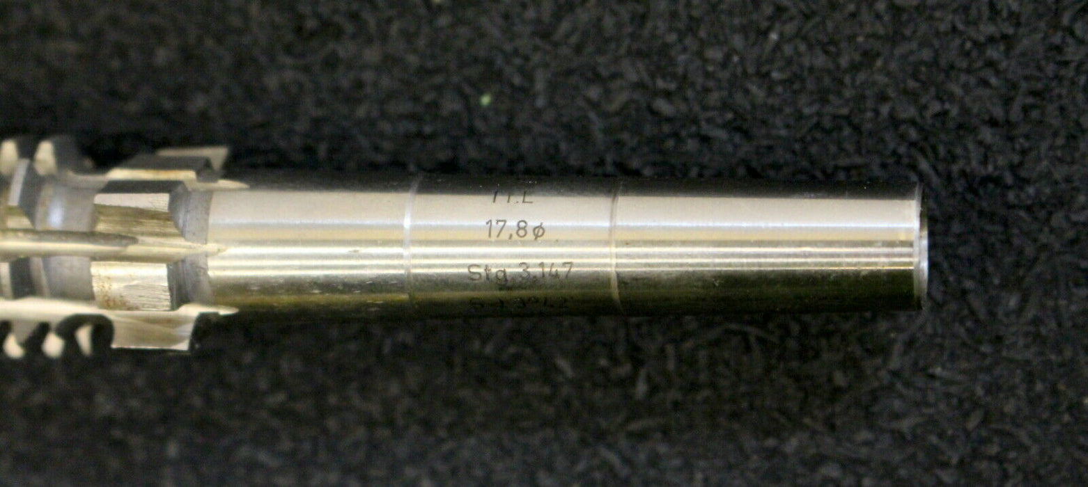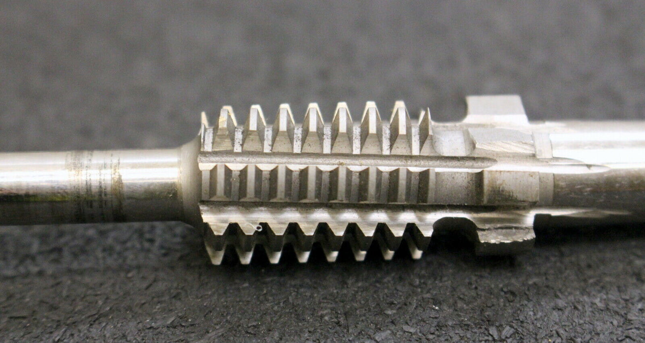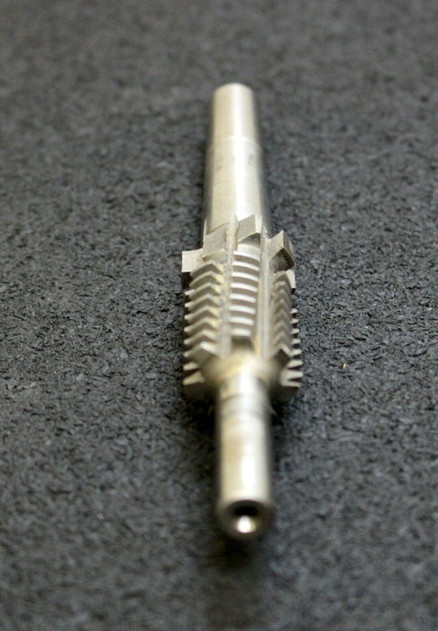 KÖPFER Schneckenrad-Radial-Schaftwälzfräser m=1,0 für SchneckenØ 17,8mm 20° EGW 1gg. Links Steigung 3,147mm Steigungswinkel 3°42´ RSp. 29" Gesamtlänge 122mm verzahnte Länge 24mm 8 Spannuten einseitig mit Zylinderschaft Ø 8mm auf der Gegenseite Konus für KÖPFER-Wälzfräsmaschine Material HSS Gewicht 50g gebraucht Restnutzungsgrad 80%