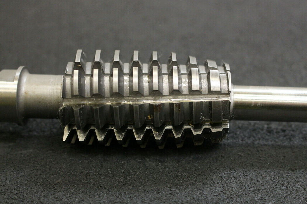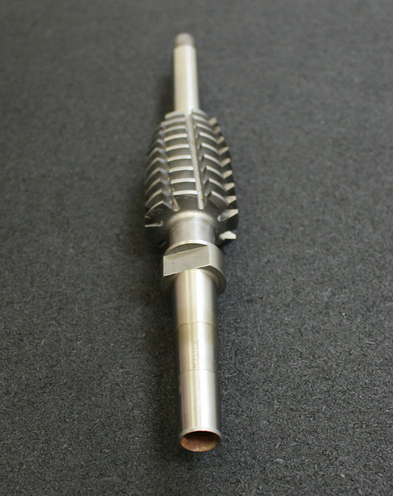 KÖPFER Schneckenrad-Tangential-Schaftwälzfräser m=2,49306 für SchneckenØ 41,5mm 20° EGW 1gg. Rechts Steigung 7,8493645 Steigungswinkel 4° LSp. 53" Gesamtlänge 260mm verzahnte Länge 70mm Zylindrischer Schaft Ø15mm 8 Spannuten mit Einschraubgewinde auf der anderen Seite Konus für KÖPFER-Wälzfräsmaschine Material HSS2 Gewicht 750g unbenutzt