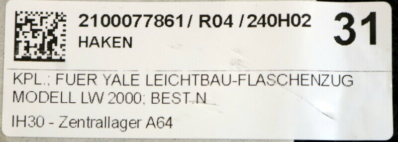 YALE Lasthaken 2t Best.Nr. 0 001 088 für YALE Leichtbau-Flaschenzug Modell LW 2000 unbenutzt Gewicht 1,44kg